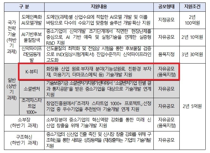 중소기업기술혁신개발사업에는 신규 기업 70개사를 선정해 총 223억원의 연구 개발비를 지원할 계획이다. 기업당 최대 2년간 10억원을 지원한다. 이 가운데 K-뷰티 분야에 50억원이 투입된다.