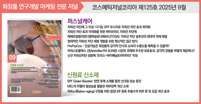 [코스인코리아닷컴 길태윤 기자] 국내 대표 화장품 연구개발(R&D)·마케팅 전문 저널 코스메틱저널코리아(CJK)가 2025년 11월호를 발간했다. 이번 호는 퍼스널케어 분야의 제형·효능 연구부터 지속가능한 신원료·신소재, 특허 정보, 연구개발뉴스까지 화장품 산업 전반의 최신 연구 흐름을 폭넓게 담았다. 11월호 특집 기사로는 ▲바이오 계면활성제를 이용한 제형 개발 – 양성자와 물 경도 사이의 경쟁 현상에 대한 물리화학 ▲BiomMucin™ Series: 동물성 뮤신 대체를 위한 지속가능한 3세대 미생물 Mucin ▲한국의 화장품 안전성 평가제도 도입에 글로벌 규제 전문가 관심 집중 등이 실렸다. 이와 함께 OEM·ODM 기업 (주)나투젠, (주)니코메디칼과 원료 선도 기업 (주)라비오, (주)리제론의 정보도 함께 수록됐다. 가장 주목되는 콘텐츠 중 하나는 신원료·신소재 코너에 실린 (주)모아캠 연구소의 ‘BiomMucin™ Series’ 연구다. 해당 연구는 미생물 발효 기반 기술을 활용해 동물성 뮤신을 대체할 수 있는 소재를 개발한 성과를 다뤘다. 연구진은 미생물이 생성하는 세포 외 고분자 물질(EPS)에 주목해 BiomMucin™ Barr